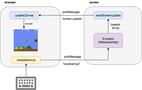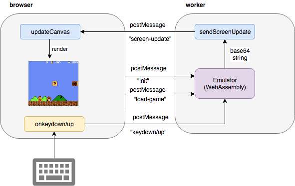Gamers usually like to play games by interacting with them via key or button presses. As Web Workers are isolated, they don’t have access to all the good stuff you get in the browser like setting up handlers for keyboard events and so on. The only way you can communicate with them is by sending them letters via the postMessage call and hoping they read them.