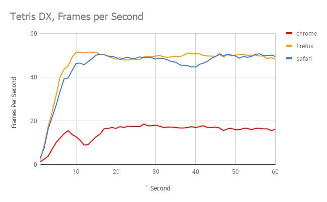 As you can see, Safari runs a pretty smooth shop. Firefox was more erratic but the emulator kept on pausing every so often so that would account for the drops. Chrome, while a fairly straight line, didn’t even make it past 20fps.