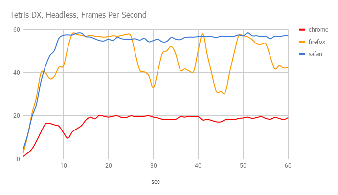 Repeating the same test with headless mode turned off, there was a definite 10 frame or so performance penalty, probably owing to the base64 conversions and passing messages bit. Oddly Firefox didn’t seem to pause at all during this test.