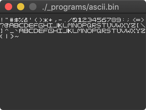 The only thing that’s different about my computer is I upgraded it to 16-bit to have more memory to play with, as storing even just the glyphs for the ASCII table would have dwarfed most of the 8-bit machine described in the book, with not much room left for useful code.