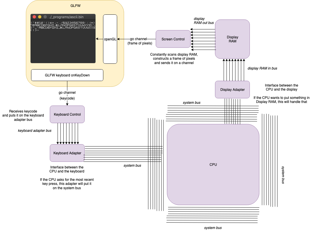 With this separation of concerns it was actually pretty simple to hook the other end of the keyboard and display to a window managed by GLFW. In fact I just pulled most of the code from my emulator and reshaped it a bit, using go channels to act as the signals in and out of the machine.