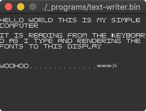 It handles keyboard inputs, and renders text to a display using a painstakingly crafted set of glyphs for a professional font I’ve named “Daniel Code Pro”. The only cheat bit is to get the keyboard input and display output working I had to hook up go channels to speak to the outside world via GLFW, but the rest of it is a simulated circuit.